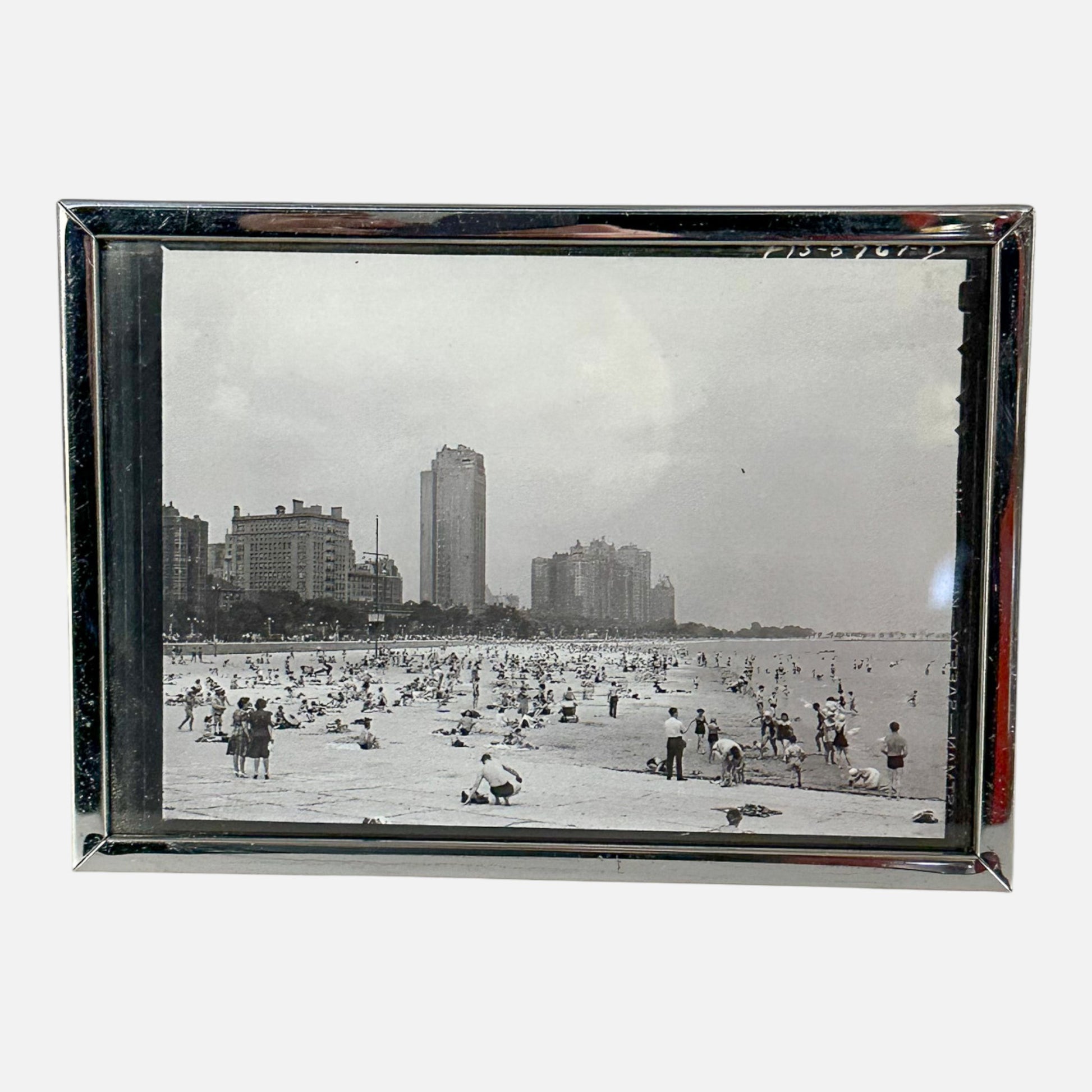 Print of black and white vintage photograph of city beach in silver frame